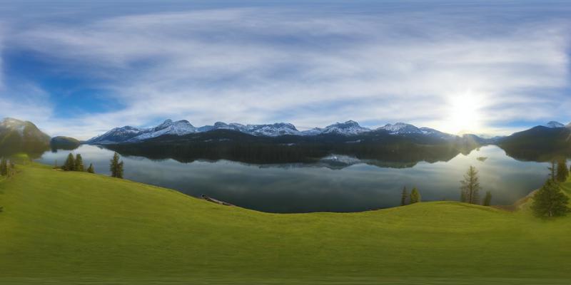 Outdoor sky with grass and a lake, snowy mountains in the background, late afternoon sun