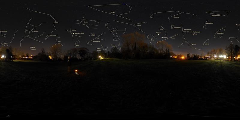 Fen Meadow by night, 12th Jan 2021, at about 21h30, with constellation lines